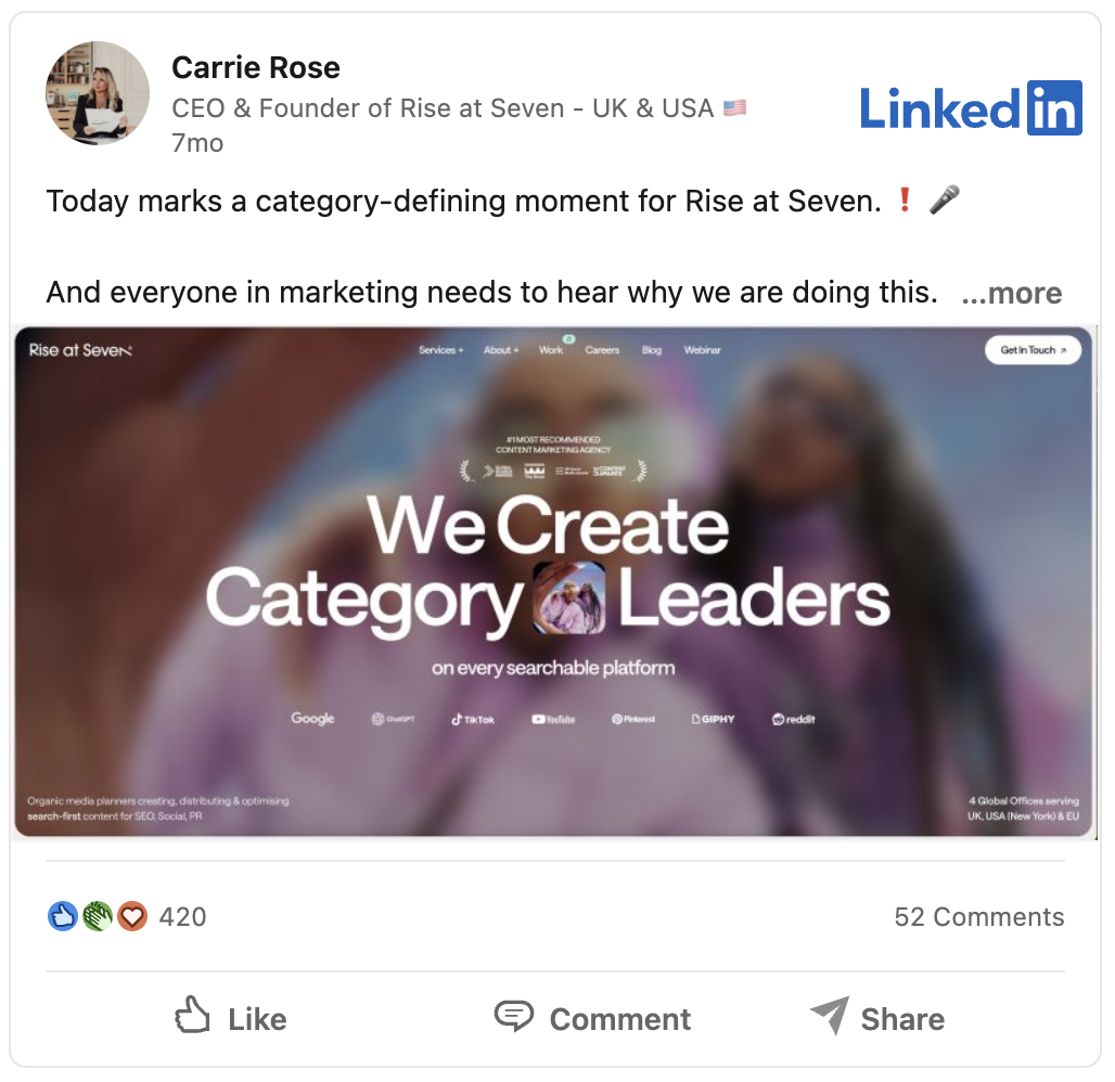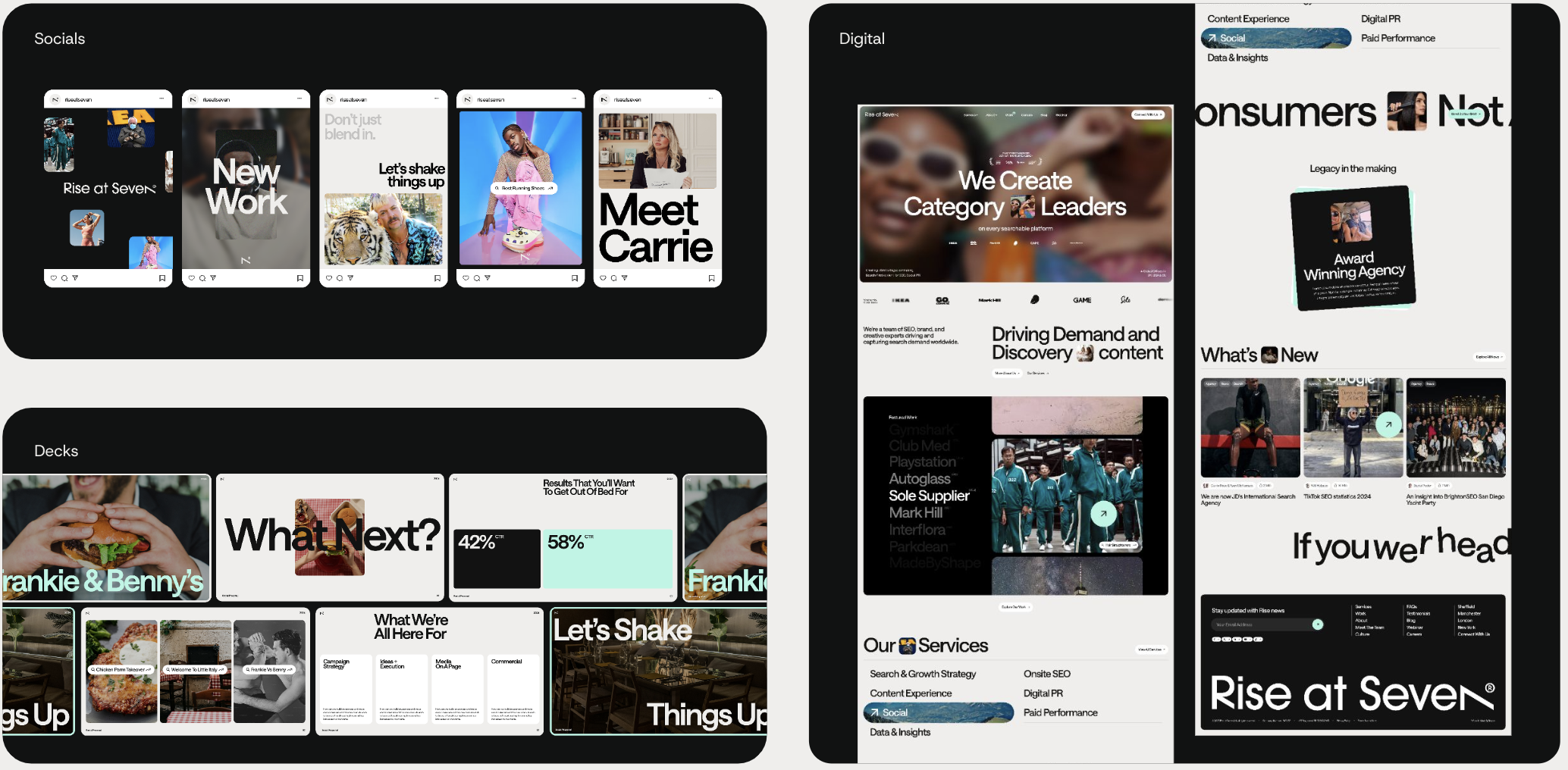 We stopped leading with SEO, PR, creative and content as outputs. We started leading with what we actually build, the outcome of working with Rise: